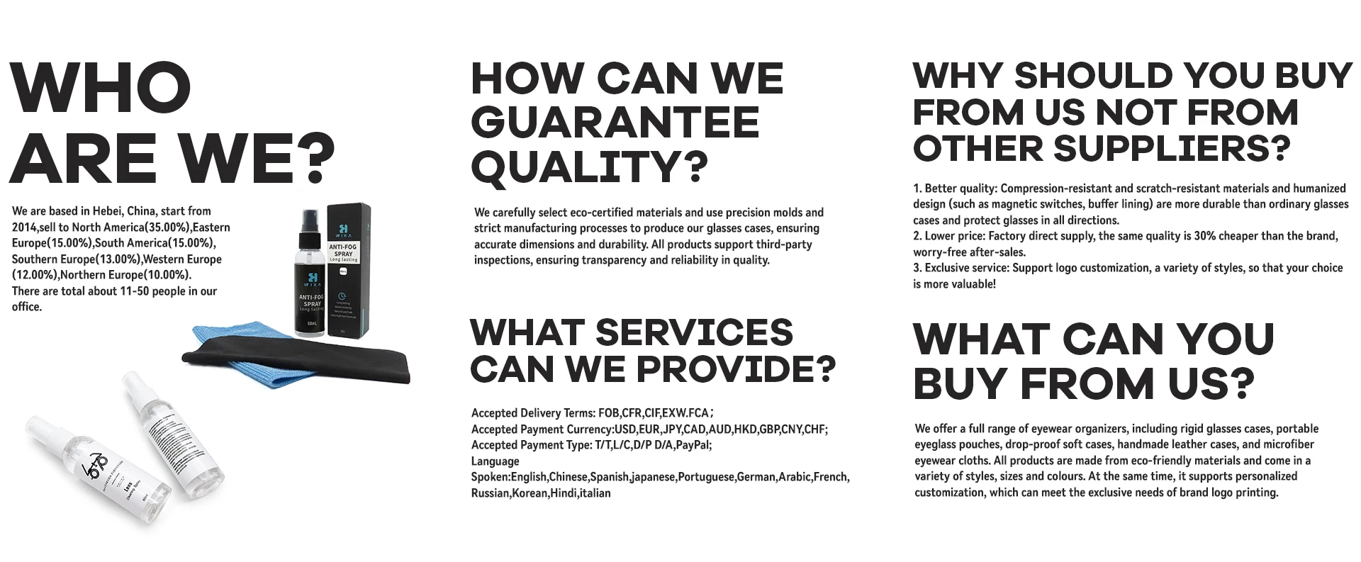 developed a wide variety of products including adults eyewear packaging, sunglasses packaging, kids sunglasses packaging, eyewear accessories products and caps.Our factory covers an area of more than 10000 square meters. We have automatic glasses case production equipment, 2 standardized glasses cases production lines, and over 40 sewing machines.